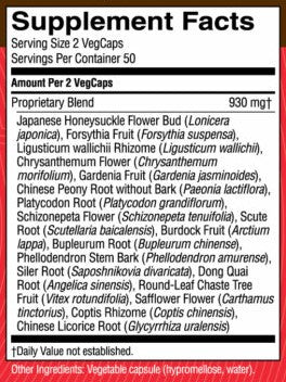 Lonicera flower bud, forsythia fruit, cnidium rhizome, chrysanthemum flowers, gardenia fruit peony root without bark, platycodon root, schizonepeta flower, scute root, arctium fruit, bupleurum root, phellodendron stem bark, siler root, tang-kuei root, vitex fruit, carthamus flowers, coptis rhizome and licorice root.