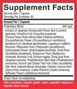 Concentrated extract of lonicera flower bud, forsythia fruit, cnidium rhizome, chrysanthemum flowers, gardenia fruit peony root without bark, platycodon root, schizonepeta flower, scute root, arctium fruit, bupleurum root, phellodendron stem bark, siler root, tang-kuei root, vitex fruit, carthamus flowers, coptis rhizome and licorice root.