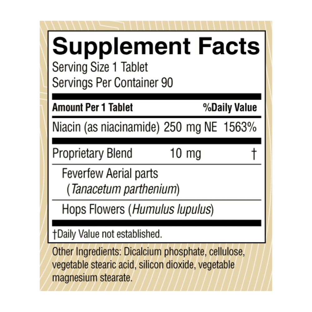 Active Ingredients250 mg niacinamide (1,250% Daily Value), hops flowers and feverfew aerial parts.