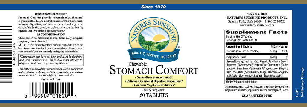 Don’t just fight excess acid, actually soothe your stomach with Stomach ComfortIn addition to neutralizing calcium, Stomach Comfort features soothing algin and slippery elm, plus papaya and ginger to support digestion. This formula has been popular for more than 20 years!