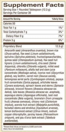 Amaranth seed, brown rice, flax seed, spirulina algae, fructooligosaccharides, quinoa seed, flax seed hull lignans, chia seed, chlorella algae millet seed, alfalfa leaf and stem juice concentrate, licorice root, soy lecithin, carrot root, lemon grass aerial parts, papaya fruit concentrate, artichoke leaves, spinach leaves and stems, broccoli flowers, kale leaves, asparagus stems, red beet root extract, bromelain (from pineapple fruit extract), chicory root, acerola fruit extract, horsetail stem and strobilus, lemon bioflavonoid extract, sodium copper chlorophyllin, parsley leaves and pau d’arco bark extract.