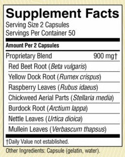 Red beet root, yellow dock root, red raspberry leaves, chickweed aerial parts, burdock root, nettle leaves and mullein leaves.