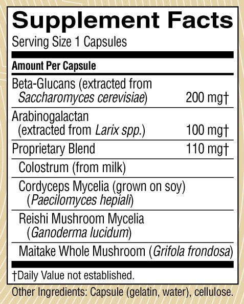 Beta-glucans, arabinogalactan, colostrum, cordyceps mycelia, reishi mushroom mycelia and maitake whole mushroom.