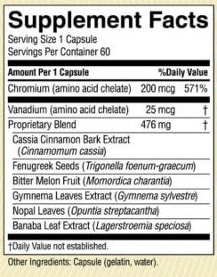 Chromium, vanadium, cinnamon bark extract, fenugreek seeds, bitter melon fruit, gymnema leaves extract, nopal leaves and banaba leaf.