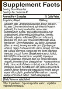 Amaranth seed, brown rice, flax seed, spirulina algae, fructooligosaccharides, quinoa seed, flax seed hull lignans, chia seed, chlorella algae, millet seed, alfalfa leaf and stem juice concentrate, licorice root, soy lecithin, carrot root, lemon grass aerial parts, papaya fruit concentrate, artichoke leaves, spinach leaves and stems, broccoli flowers, kale leaves, asparagus stems, beet root concentrate, bromelain (from pineapple fruit extract), chicory root, acerola fruit extract, horsetail stem and strobilus, lemon bioflavonoid extract, sodium copper chlorophyllin, parsley leaves and pau d’arco bark extract.