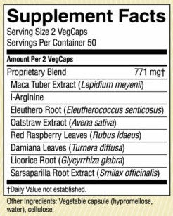 Maca root extract, l-arginine, eleuthero root, oat straw extract, red raspberry leaves, damiana leaves, licorice root and sarsaparilla root.