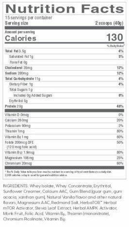 Whey Isolate, Whey Concentrate, Erythritol (sugar alcohol), Cocoa [processed with alkali], Sunflower Creamer, Natural Flavors, Calcium AAC (amino acid chelate), Gum Blend (guar gum, gum acacia, xanthan gum), Magnesium AAC (amino acid chelate), HerbaTORTM Herbal mTOR Activator, Redmond Salt, Stevia Leaf Extract, Herbal AMPK Activator, Monk Fruit, Folic Acid, Vitamin B6, Thiamin (mononitrate), Chromium Picolinate, Vitamin B12