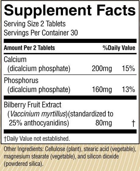200 mg calcium, 160 mg phosphorus and bilberry fruit extract.