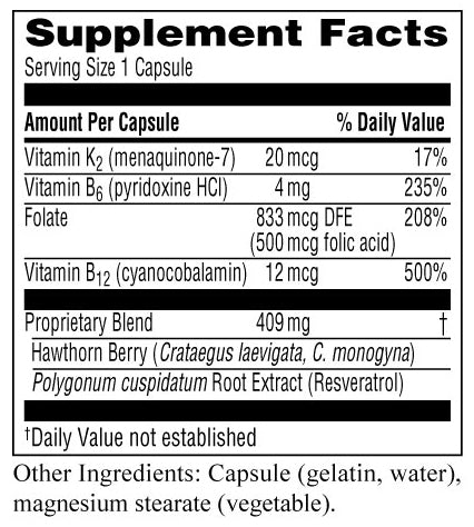 Vitamin K2, vitamin B6, folic acid, vitamin B12, hawthorn berries and resveratrol.