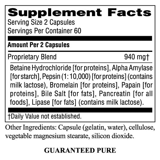 This formula includes pepsin, which is used for pre-digesting proteins in the stomach. Betaine HCl helps create an acidic environment to facilitate the activity of pepsin. The enzymes bromelain and papain aid in the digestion of proteins. After food reaches the small intestine, pancreatin, which also supports the pancreas, further digests protein, carbohydrates and fats. Alpha amylase digests starches. Bile salts make fats soluble, preparing them for further digestion by lipase.
