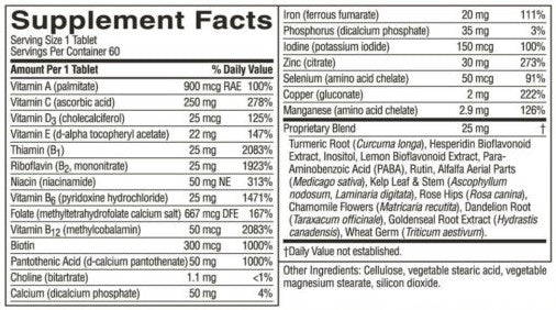 Time Release Version: Provides vitamins A, C, D3, E, thiamin (B1), riboflavin (B2), niacin, B6, methyltetrahydrofolate, methylcobalamin, biotin, pantothenic acid, choline, calcium, iron, phosphorus, iodine, zinc, selenium, copper, manganese, plus turmeric root, hesperidin bioflavonoid extract, inositol, lemon bioflavonoid extract, PABA, rutin, alfalfa aerial parts, kelp leaf and stem, rose hips, chamomile flowers, dandelion root, goldenseal root extract and wheat germ.