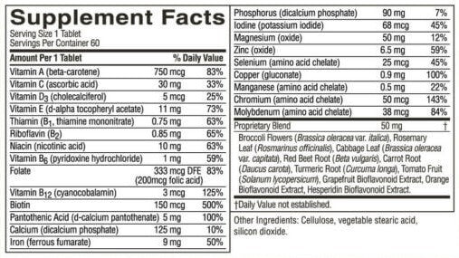 Provides 100% of the Daily Value of vitamin A, C, D, E, thiamin (B1), riboflavin (B2), niacin, B6, folic acid, B12, biotin, pantothenic acid, iron, iodine, zinc, copper and molybdenum. Also contains calcium, phosphorus, magnesium, selenium, manganese and chromium, plus broccoli flowers, turmeric root, red beet root, rosemary leaves, carrot root, tomato fruit, cabbage leaves, orange bioflavonoids, grapefruit bioflavonoids and hesperidin.