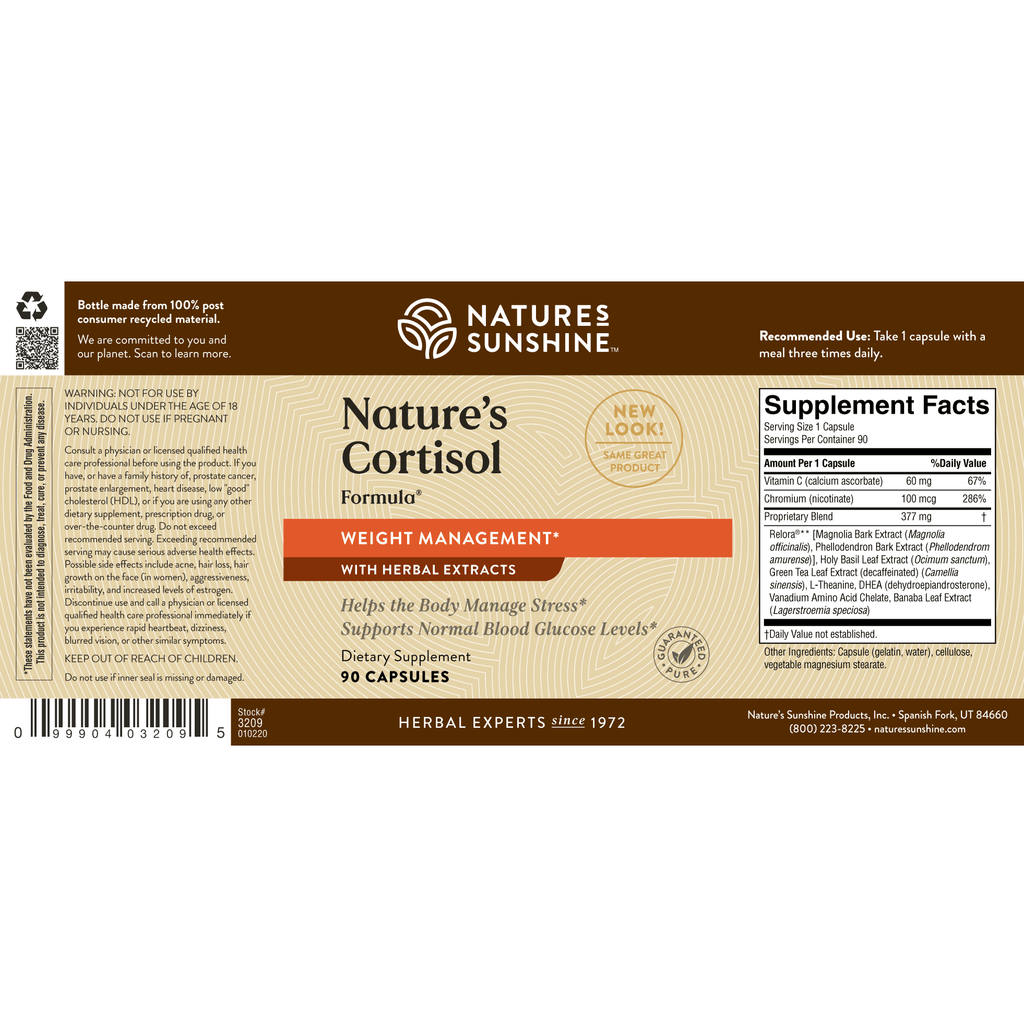 This formula contains Relora® to help the body manage stress and maintain cortisol levels already within the normal range. Other key ingredients—banaba, holy basil, chromium and vanadium—help maintain blood glucose levels already within the normal range. This product also features DHEA, a hormone precursor that interacts with the adrenal glands, which may subsequently affect cortisol production. Nature’s Cortisol Formula also features decaffeinated green tea extract (60% EGCG), l-theanine (Suntheanine®, which supports the body during times of stress) and calcium ascorbate.