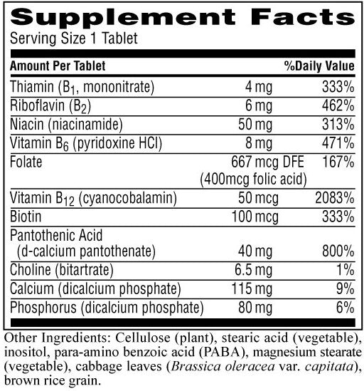 Provides 150% or more of the Daily Value of thiamin, riboflavin, niacinamide, vitamin B6, folate, vitamin B12, biotin and pantothenic acid, plus choline, calcium, phosphorus, inositol, PABA, cabbage leaves and brown rice grain.