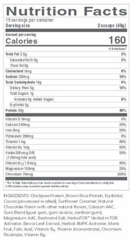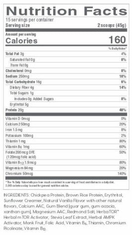 Chickpea Protein, Brown Rice Protein, Erythritol (sugar alcohol), Sunflower Creamer, Natural flavors, Calcium AAC (amino acid chelate), Gum Blend (guar gum, gum acacia, xanthan gum), Magnesium AAC (amino acid chelate), Redmond Salt, HerbaTORTM Herbal mTOR Activator, Stevia Leaf Extract, Herbal AMPK Activator, Monk Fruit, Folic Acid, Vitamin B6, Thiamin, Chromium Picolinate, Vitamin B12