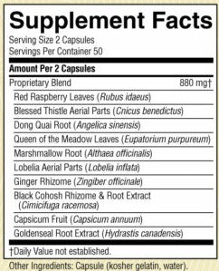 Red raspberry leaves, blessed thistle aerial parts, dong quai root, queen of the meadow leaf, marshmallow root, lobelia aerial parts, ginger rhizome, black cohosh rhizome and root extract, capsicum fruit and goldenseal root extract.