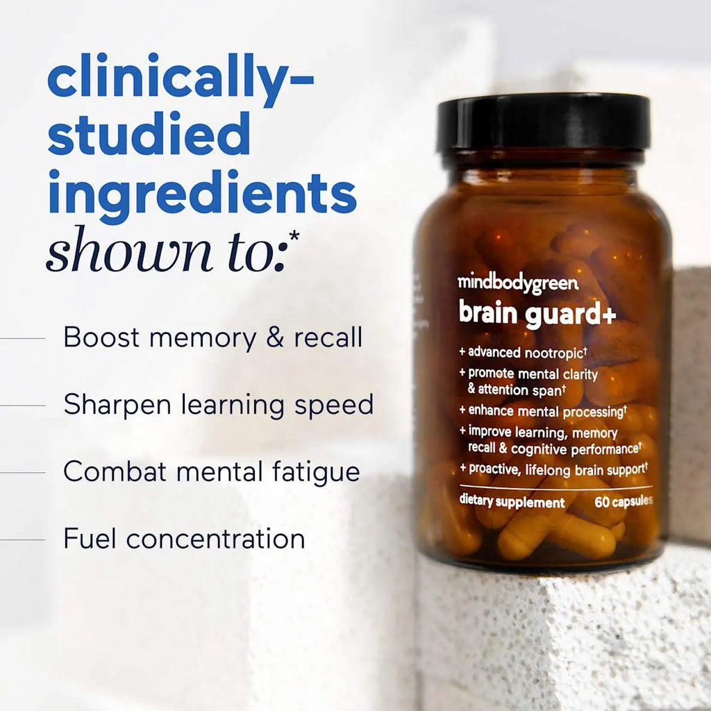 Our brain guard+ dietary supplement is a "nootropic," a scientific term that refers to a nutrient, botanical phytonutrient, bioactive, or combination of those ingredients that has the ability to act in helpful ways in the central nervous system (CNS), specifically the brain—to promote the health of the brain and enhance its functions. In layman's terms, nootropic actions confer "brain power" in the broadest sense. More specifically, this could look like mental clarity and sharpness, memory, neuronal function, neurotransmitter balance, cognitive performance, and more.*