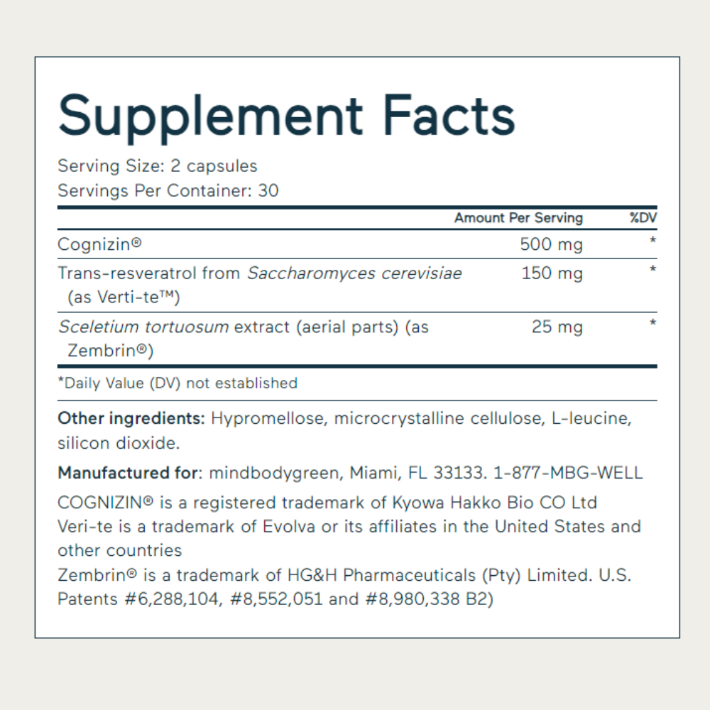 Cognizin® 500 mg*, Trans-resveratrol from Saccharomyces cerevisiae (as Verti-te™) 150 mg*, Sceletium tortuosum extract (aerial parts) (as Zembrin®)25 mg*
