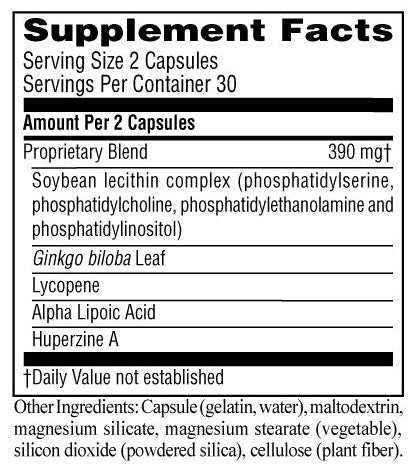 Soybean lecithin complex (phosphatidylserine, phosphatidylcholine, phosphatidylethanolamine and phosphatidylinositol), ginkgo leaves, lycopene, alpha lipoic acid and Chinese club moss whole plant extract.