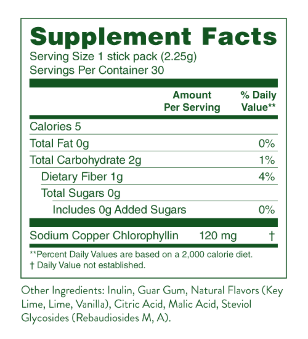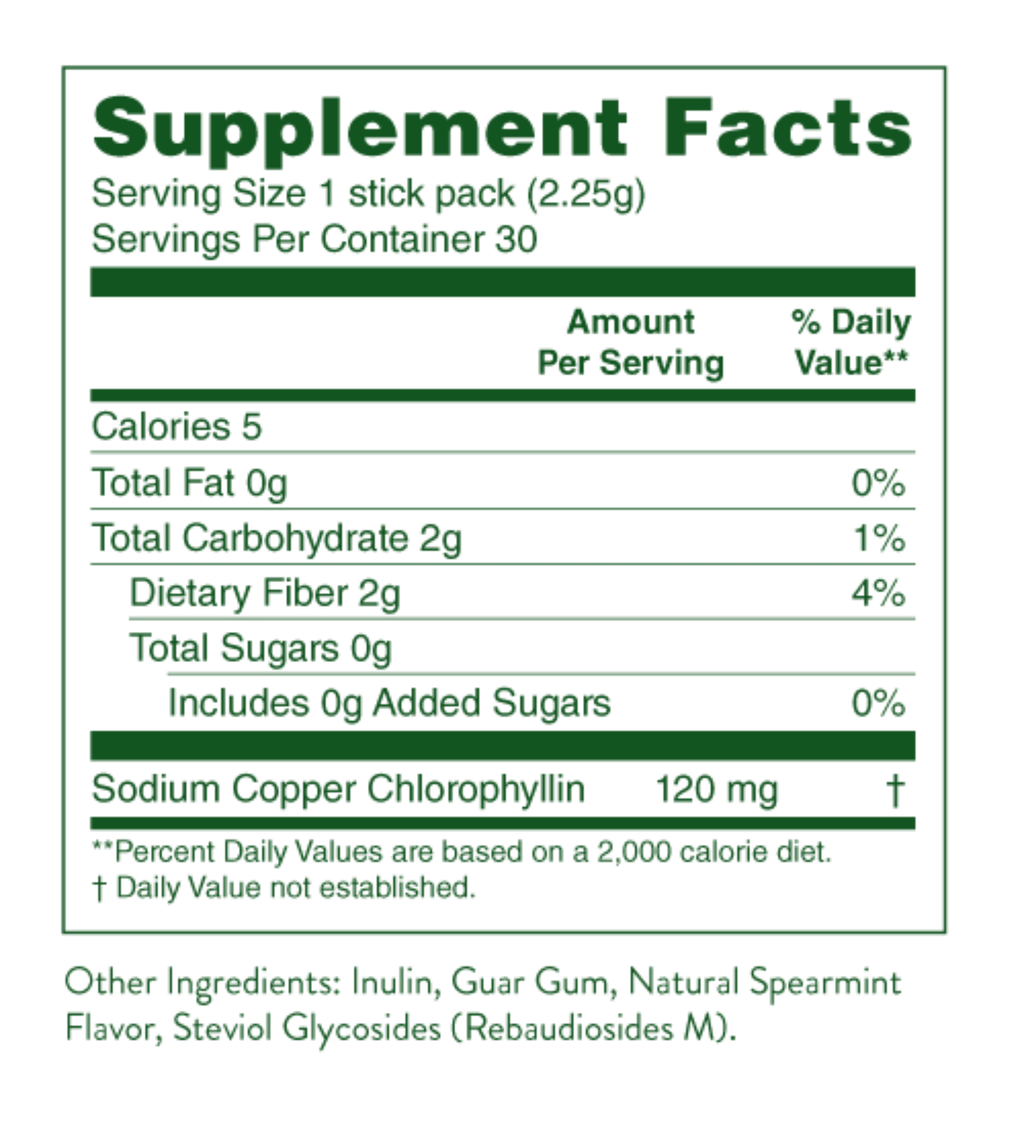 Now, for the first time ever, you can enjoy the benefits of Chlorophyll in a paraben-and-preservative free powder. Easy to mix, delicious, and delivering 20%-to-140% more of the active ingredient per serving than the other brands. With these convenient stick packs, you never have to miss your daily detox.