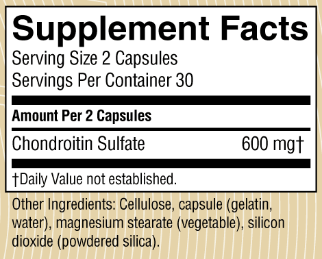 Cartilage functions to protect bones from moving against each other and to reduce friction. Chondroitin helps bond connective tissue to maintain strength and inhibits enzymes that can deplete cartilage nutrition. It helps retain moisture in the joints, allowing for flexibility and resiliency, and cushioning against activities like jumping and lifting.In addition, chondroitin works with other nutrients like glucosamine to stimulate the rebuilding and maintenance of cartilage. The body produces chondroitin, but that production decreases as we age. Chondroitin is found in foods, but usually only in small amounts. Fortunately, the body absorbs chondroitin well, making supplementation a viable alternative.