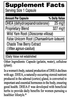 25 mg DHEA, wild yam root, false unicorn root and chaste tree berry extract.