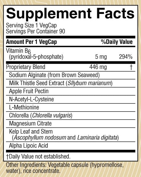 5 mg vitamin B6, magnesium citrate, sodium alginate, apple fruit pectin, N-acetyl cysteine, l-methionine, kelp leaf and stem, and alpha lipoic acid.
