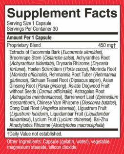 Concentrated extract of eucommia bark, cistanche stem, achyranthes root, drynaria rhizome, hoelen sclerotium, morinda root, rehmannia root tuber, Sichuan teasel root, Asian ginseng root, Asiatic dogwood fruit without seeds, astragalus root, barrenwort leaf, Chinese yam rhizome, dong quai root, ligustrum fruit, liquidambar fruit, lycium fruit and Bai-zhu atractylodes rhizome.