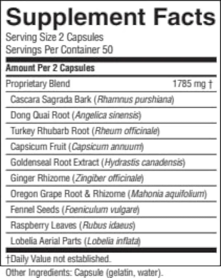 Cascara sagrada bark, dong quai root, Turkey rhubarb root, capsicum fruit, goldenseal root and rhizome, ginger rhizome, Oregon grape root and rhizome, fennel seeds, red raspberry leaves and lobelia aerial parts.