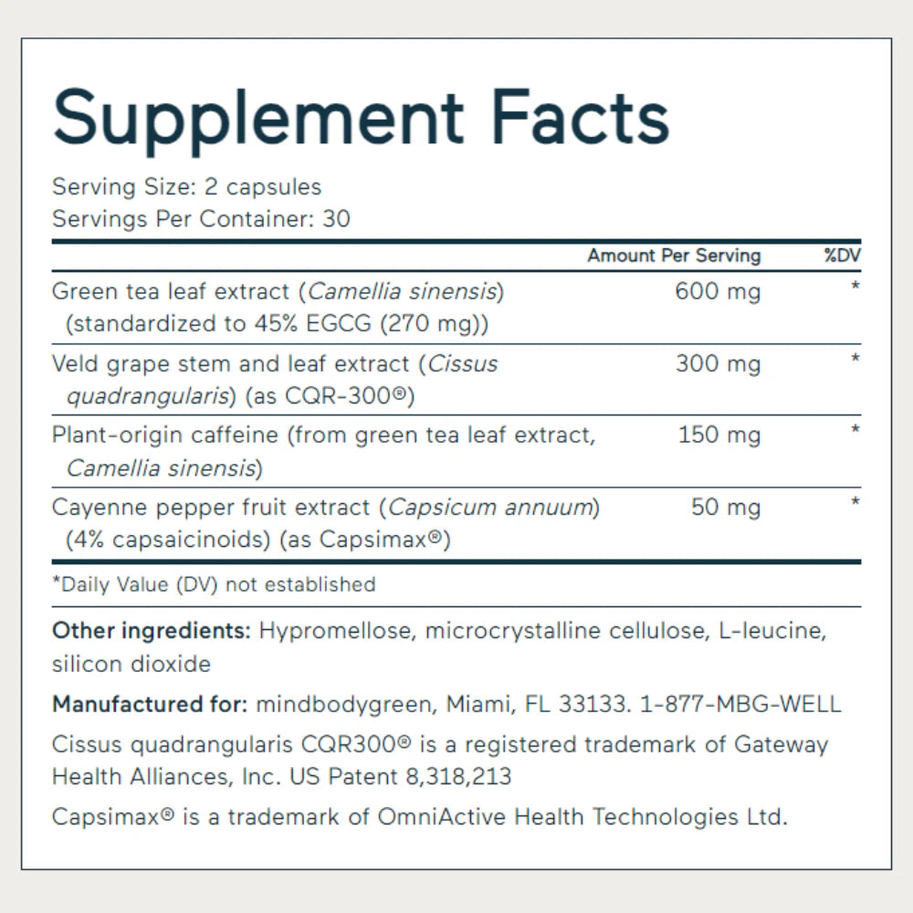 To further synergize healthy lifestyle and nutrition choices, targeted botanicals support essential components of metabolism and metabolic health. These botanical extracts include veld grape, cayenne pepper, and EGCG plus caffeine from green tea leaves.*