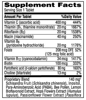 Provides vitamin C, thiamin (B1), riboflavin (B2), niacin, B6, folic acid, B12, biotin and pantothenic acid, plus schizandra fruit, choline, inositol, bee pollen, PABA, lemon bioflavonoids, valerian root extract, passionflower flowers extract and hops flowers extract.