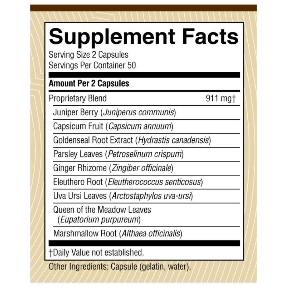 Active IngredientsJuniper berries, goldenseal root and rhizome, capsicum fruit, parsley leaves, ginger rhizome, eleuthero root, uva ursi leaves, queen of the meadow leaves and marshmallow root.