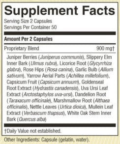 Juniper berries, slippery elm bark, licorice root, rose hips, garlic bulb, yarrow aerial parts, capsicum fruit, golden seal root extract, uva ursi leaf extract, dandelion root, marshmallow root, nettle leaves, mullein leaf extract and white oak stem inner bark.