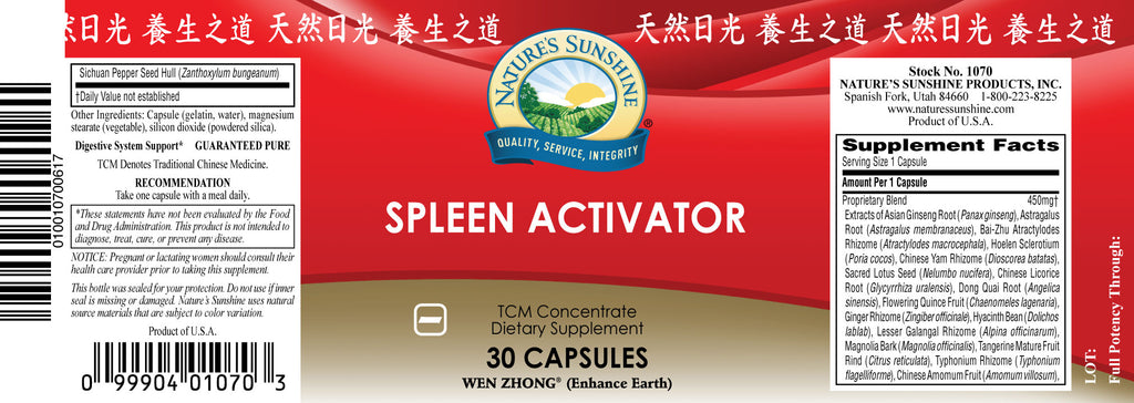 According to Eastern philosophy, life permits us to work with what we have on earth here and now—body and mind—in order to reclaim and maintain the innate energy and spirit that reside within us. Energy and spirit must be awakened, nurtured and balanced in order for life to flourish. TCM philosophy names five distinct energies that permeate the body: Fire, Earth, Metal, Water and Wood.In order to feel your best, these energies must be in balance. Spleen Activator, wen zhong (Enhance Earth) formula, is based on Traditional Chinese Medicine. Your Earth is extremely important as it touches upon your spleen, pancreas and stomach. Digestion and good gut composition are crucial to feeling well.