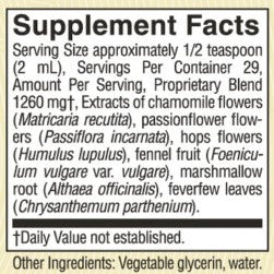 Extracts of chamomile flowers, passionflower aerial parts, hops flowers, fennel seeds, marshmallow root and feverfew leaves in vegetable glycerin and purified water.How to Use