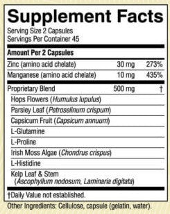 Provides 200–500% of the Daily Value of zinc and manganese. Also contains hops flowers, parsley leaves, capsicum fruit, Irish moss plant and kelp plant leaves and stem.