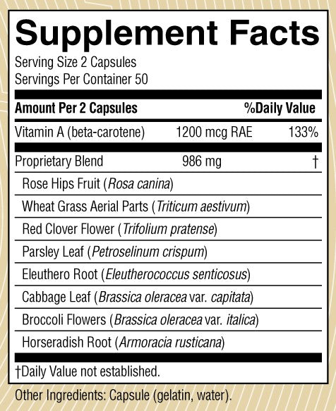Vitamin A, rose hips fruit, wheat grass aerial parts, red clover flowers, parsley leaves, eleuthero root, cabbage leaves, broccoli flowers and horseradish root.