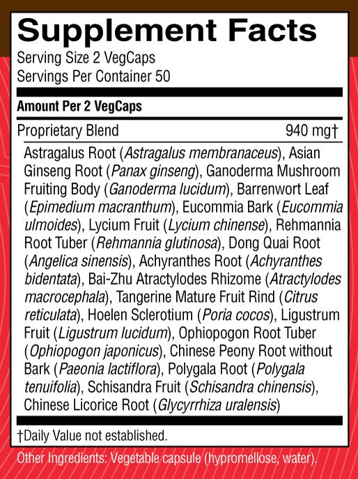 Astragalus root, ginseng root, epimedium leaf, eucommia bark, ganoderma mushroom, lycium fruit, rehmannia root tuber, achyranthes root, tang-kuei root, atractylodes rhizome, citrus peel, hoelen sclerotium, ligustrum fruit, ophiopogon root tuber, peony root without bark, polygala root, schizandra fruit and licorice root.