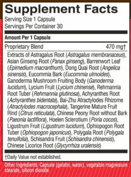 Concentrated extract of astragalus root, ginseng root, epimedium leaf, eucommia bark, ganoderma mushroom, lycium fruit, rehmannia root tuber, achyranthes root, tang-kuei root, atractylodes rhizome, citrus peel, hoelen sclerotium, ligustrum fruit, ophiopogon root tuber, peony root without bark, polygala root, schizandra fruit and licorice root.