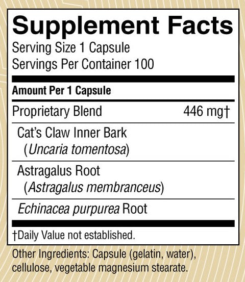 Uña de gato inner bark, astragalus root and Echinacea purpurea root.