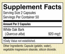 Because of its ability to tighten and tone, white oak bark has often been used for its benefits for varicose veins. White oak bark has also been used externally for skin issues like eczema and cuts, burns, and bruises. It has been historically used for wounds because it's a styptic herb, meaning it can stop bleeding. Another frequent and traditional use for white oak bark is to ease diarrhea. The tannins present in oak bark help to strengthen intestinal lining and help the body transition from watery stools to normal.Ingredients
