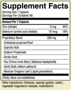 Echinacea purpurea root, caprylic acid, sodium propionate, sorbic acid, pau d’arco inner bark, garlic bulb and oregano leaf, plus selenium and zinc.